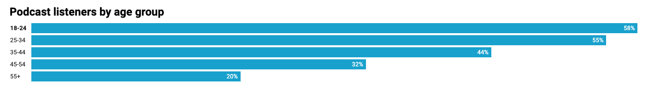 Younger audiences prefer to get their news through audio and video than older audiences. Amongst audiences 25- to 34-years-old, 55 per cent listen to podcasts, and 18- to 24-year-olds, listen even more (58 per cent).