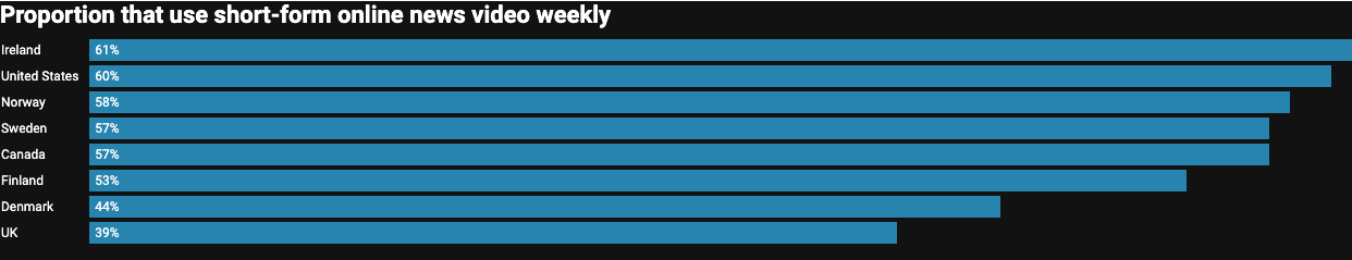 The shift to video by audiences has been even more dramatic, although variation exists across countries. In Ireland, 61 per cent of audiences view short-form online news video weekly, with similar figures in the US, Norway, Sweden and Canada. But in the UK, the figure drops to 39 per cent.