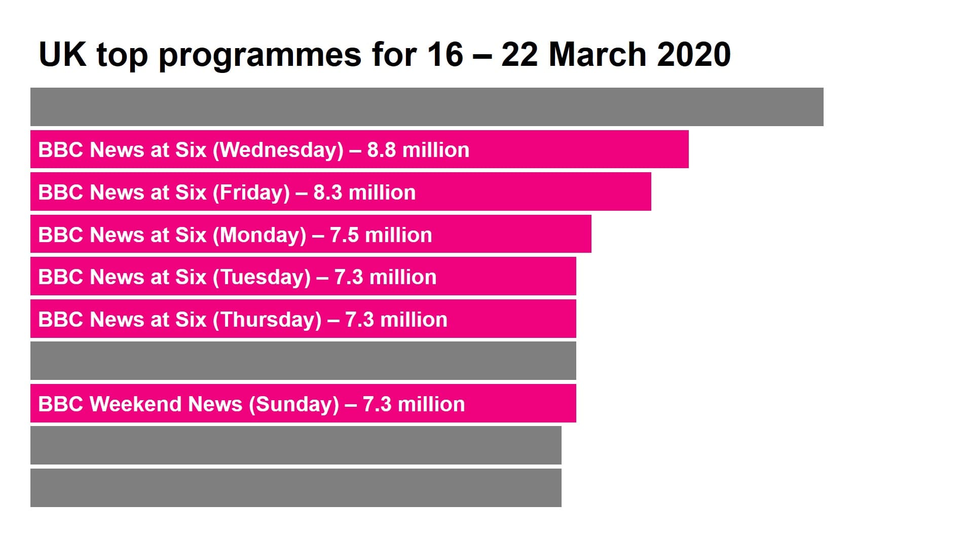The latest viewing figures reported by the UK Broadcasters’ Audience Research Board (BARB) show that between 16 and 22 March, the week that the UK government began introducing measures to slow the spread of covid-19, six of the top 10 most viewed programmes were news bulletins - all by the BBC.