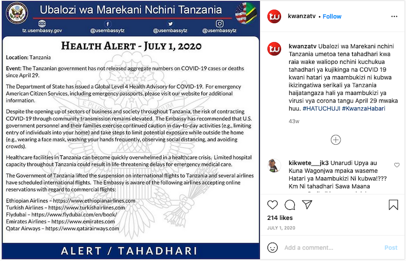 Tanzania – Kwanza Online TV was suspended for 11 months by the Tanzania Communications Regulatory Authority after "generating and disseminating biased, misleading and disruptive content." The move came after the station shared a health alert on Instagram from the US Embassy, noting the Tanzania government had not published any numbers on covid-19 cases or deaths since 29 April.