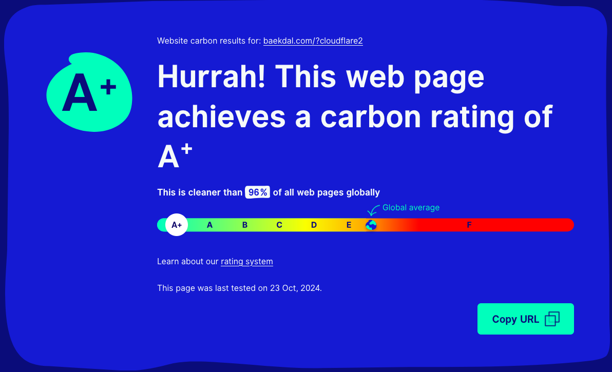 For example, Baekdal.com, run by media anaylst Thomas Baekdal, scores A+, 96 per cent cleaner than global web pages. He uses green web provider Kualo, and a renewable energy firewall from Cloudfare, as part of a strict anti-bot system. NB: this score is after instructing the firewall to allow Website Carbon Calculator to access the site. Individual articles might score lower as well owing to larger sized images and assets.