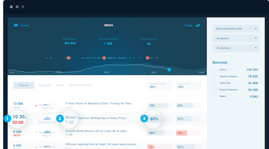 Let’s look at a simple example: an editor posts an article about Brexit and wants to make sure it performs well. To check on progress, the editor refers to his dashboard and three crucial metrics: