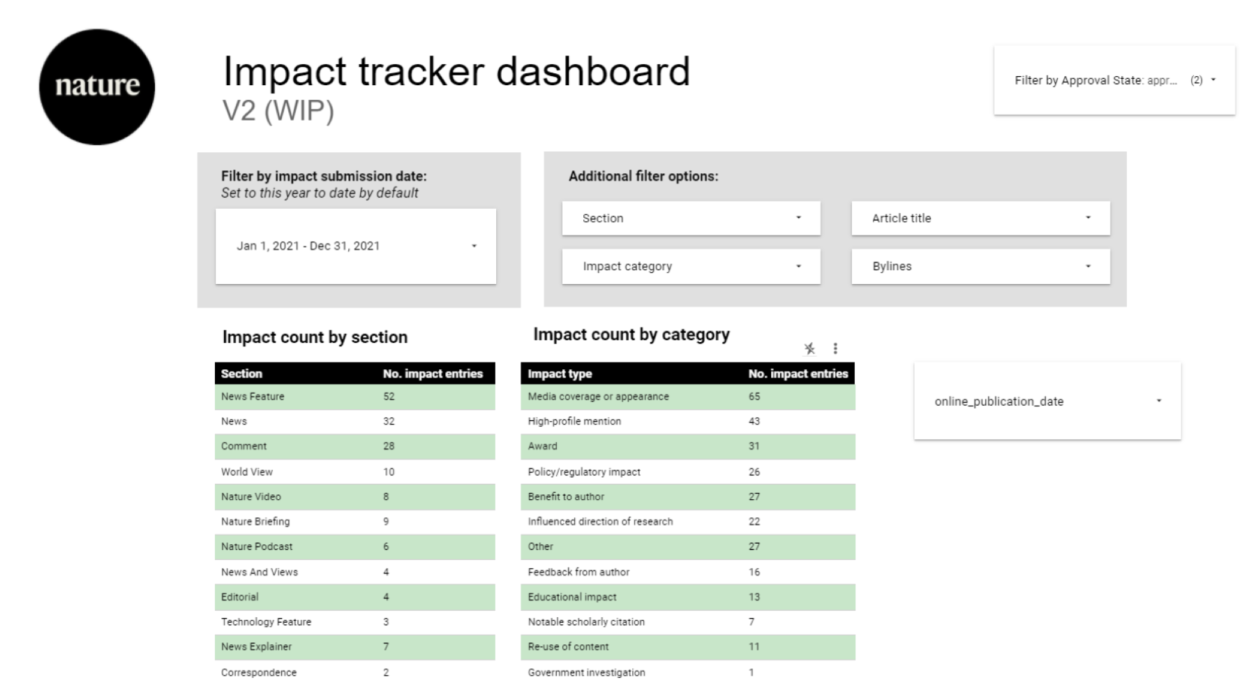 Nature's Impact Tracker - which recently won an INMA Award for Best Practice - was a multi-year collaboration between Nature and Altmetric (which built the tracker). It was first conceived by Anna Jay and Helen Pearson and funded by the Google News Initiative.