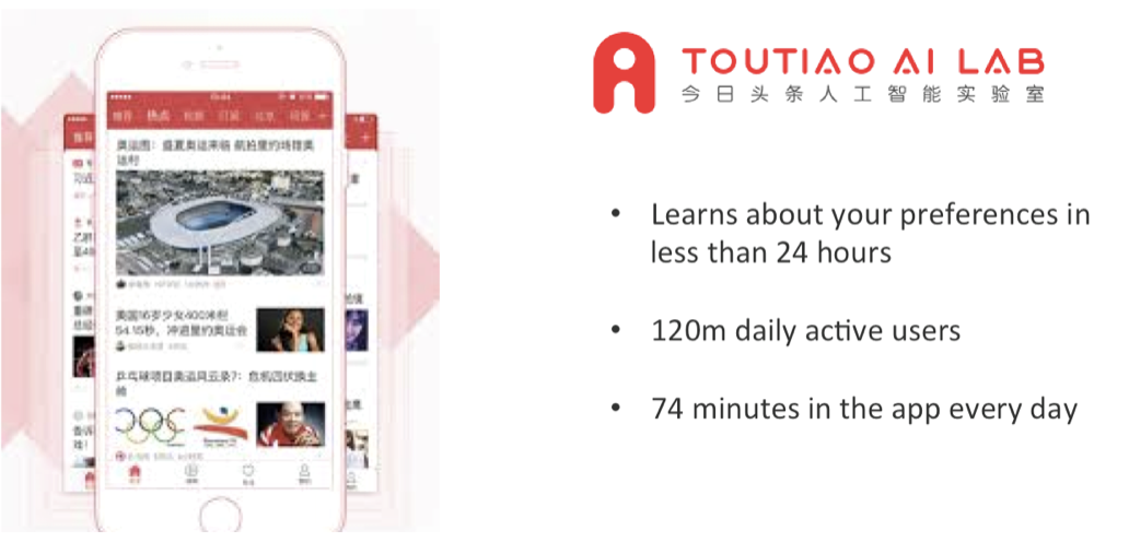 An example of how this works comes from China where the most successful news app, Toutiao, has built an audience of 120 million with individual engagement times of 74 minutes per day. Newsfeeds are constantly updated based on what its machines have learnt about reading preferences, time spent on an article, and location. Toutiao claims to have a user figured out within 24 hours.