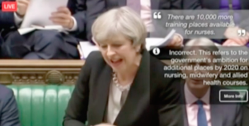 Full Fact, the UK’s independent fact-checking organisation, is deploying Natural Language Processing (NLP) with previously fact-checked databases of political claims to test this kind of service to develop two products aimed at helping journalists and fact-checking professionals. The first, Live (see picture prototype below), aims to provide subtitles to fact-check television in real time while the second, Trends, monitors repeated claims and determines who’s making them and where they’re being made, allowing fact-checkers to form a better understanding of why a specific claim is being repeated and to better target correction requests. Both products are due to be released by the end of 2018.