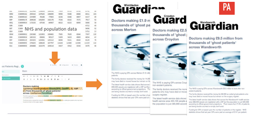 As one example, the Press Association (PA) in the UK has been working with Urbs media to deliver hundreds of semi-automated stories for local newspaper clients (see below). First, a journalist finds a story using one or more publicly available datasets (NHS and population data). The journalist then writes a generic story that is versioned automatically by the computer to create multiple bespoke versions for different local publications. Artificial intelligence is used in a relatively simple way to learn and deal with nuances of language such as swapping out ‘in the Isle of Wight’ for ‘on the Isle of Wight’.
