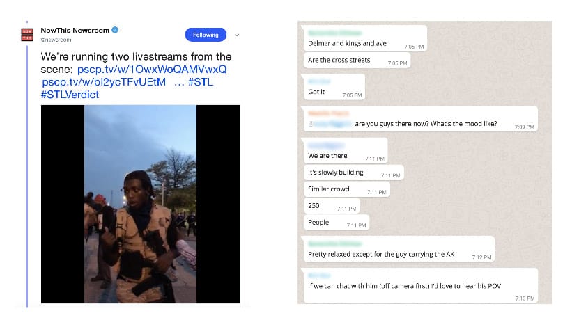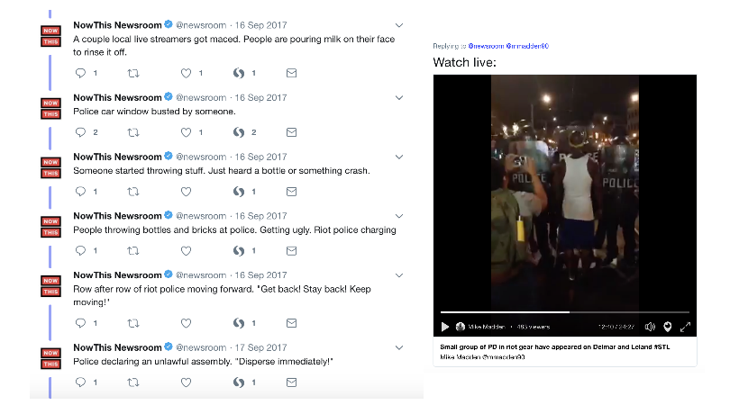 NowThis sent 10 producers organised in three field teams of video journalists to St. Louis, and coordinated their reporting activities publicly through the @newsroom Twitter account.