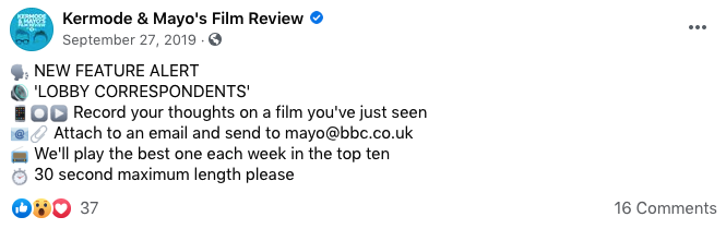 In late 2019, BBC Radio’s flagship film program, Kermode and Mayo’s Film Review encouraged listeners to submit their own thoughts they have seen via a 30-second audio recording. They then play the best of these on air.