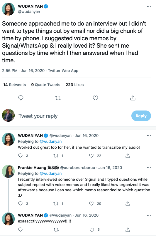 As the journalist and co-host of The Writers’ Co-op Podcast, Wudan Yan has shared, voice memos could also be used as a means to replace email interviews.