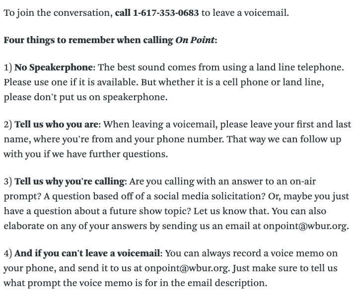 Of course, radio stations, especially talk radio stations, have long sought input from their audience on the phone. But this engagement does not have to be live, and *On Point’s* use of voicemail reminds us that newspapers and other outlets can also use this technology for tip lines, story pitches and feedback.