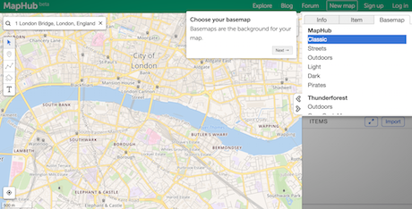 3 – Next, choose the background of your map from a list of options that include MapHub's own six layouts, and a list of others from Thunderforest, MapQuest and CartoDB for example. I chose the Outdoors background.
