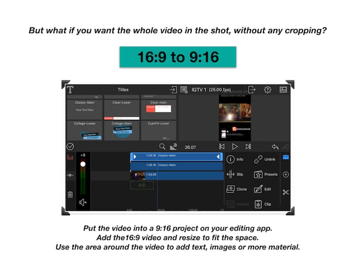 She also said the same technique works when taking a horizontal video and making it vertical. Alternatively, she also suggested using the app Unfold to create a page with the video included in it or making the video fill the entire space and altering the position of each individual clip to fit the grid and make sure the action is not lost.
