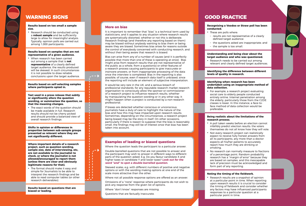 The guide encourages journalists to be cautious about results based on samples that are not representative of a given audience, noting the timing of fieldwork and how that might influence responses, and question whether the sample size is sufficiently large for meaningful analysis.