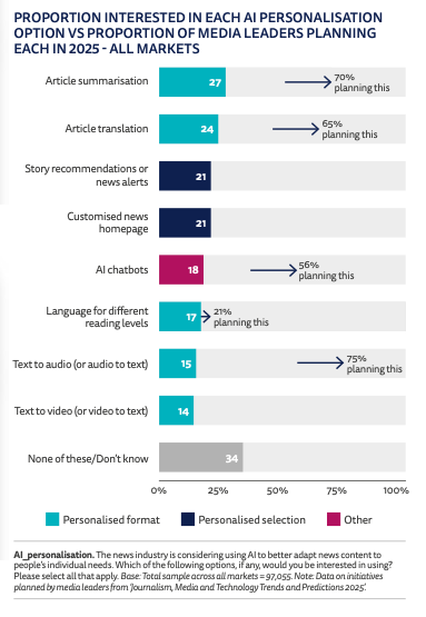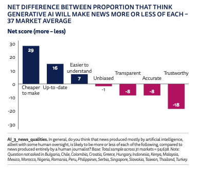 Key stat: Audiences think AI will make news less transparent (8 per cent), less accurate (8 per cent) and less trustworthy (18 per cent).