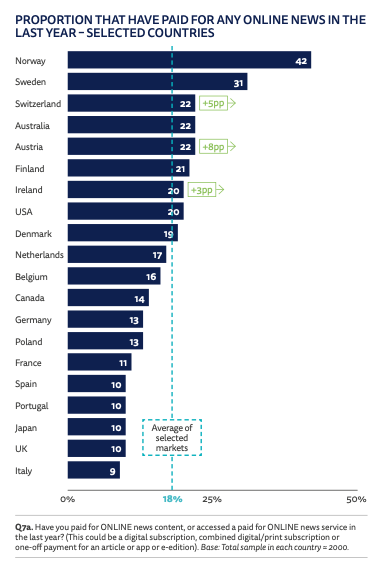 Key stat: The average proportion of consumers who have paid for any online news increased to 18 per cent (+1 percentage point) in 2025, with penetration nearly doubling over the past decade across 20 rich media markets.