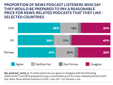 Key stat: 73 per cent say listening to podcasts helps them understand issues more deeply than other media, while 42 per cent of news podcast listeners would pay a reasonable price for news-related podcasts they like.