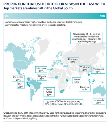 Key stat: TikTok is the fastest-growing social platform for news, with 17 per cent using it for news globally (+3 percentage points year-on-year). Thailand (49 per cent) tops the list for weekly news consumption on TikTok, while the UK languishes at the bottom (6 per cent).