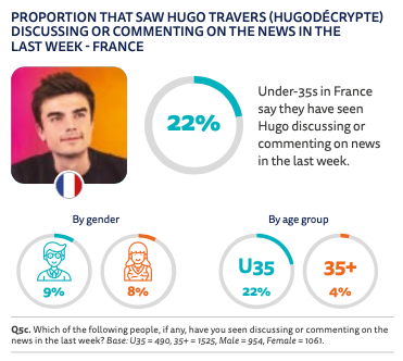 Key stat: French news creator Hugo Travers reaches 22 per cent of under-35s, but just four per cent of over 35s.