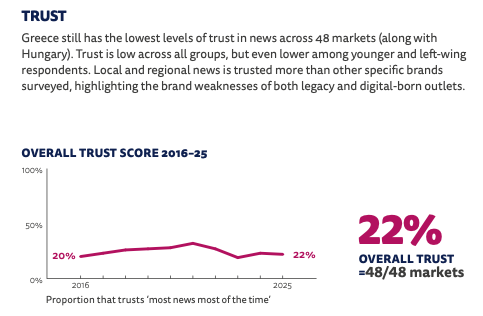 Key stat: In Morfis's market of Greece, 60 per cent sometimes or often avoid the news. It is also joint-lowest for trust (22 per cent) alongside Hungary.