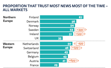 Key stat: The Netherlands records quite low willingness to pay for news (17 per cent), but is the third strongest market for trust towards the news (50 per cent), but has slipped four percentage points.