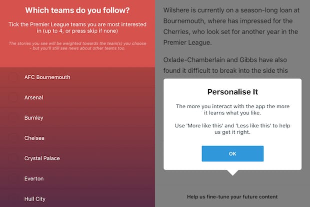 For example when a user downloads 11versus11, they can actively personalise their upcoming editions by choosing which football teams to follow, as well as by using the 'more like this' and 'less like this' buttons at the bottom of each article. The app will then provide stories based on their preference and their behaviour within the app.