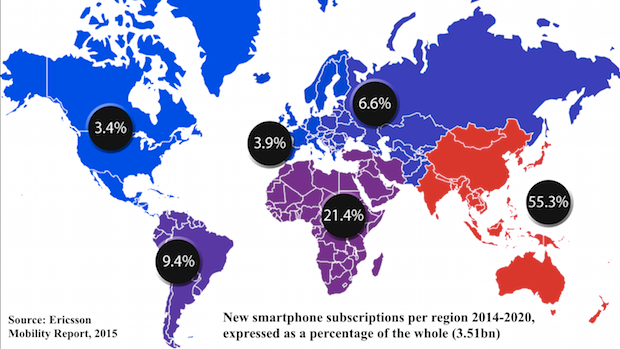 Additionally, the latest Ericsson Mobility Report noted that of the 3.51 billion smartphones around the world, between 2014 and 2020 only 7.3 per cent will be in Europe and the US – the areas that invest predominantly in iOS devices.