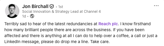 Jon Birchall, who spent seven years with Reach and is now social innovation and strategy lead at Channel 4, described the news as "terribly sad" and offered to help affected colleagues.