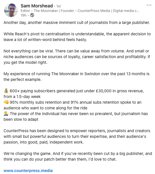Other journalists can set up their own site through CounterPress removing a lot of the heavy lifting. More on the platform here.