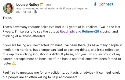Keep an eye on our jobs board for the latest opportunities in the media sector. But can you help? Do reach out to those made redundant if you are hiring - after all, there is a lot of excellent talent about to hit the market.
