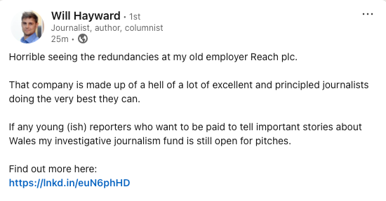 Will Hayward, a former Welsh affairs editor for Reach plc title Wales Online, reminded everyone that he is running a scheme for Welsh investigative journalists that is still open for submissions. More details here.