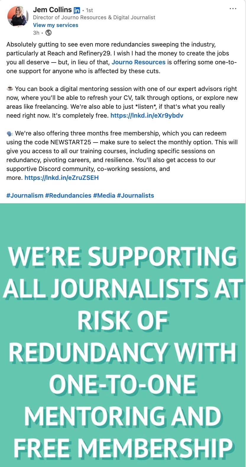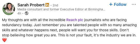The journalism community is banding around those affected by the latest wave of redundancies announced by Reach plc.