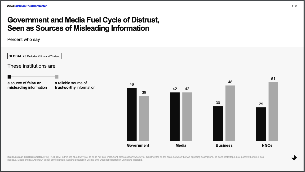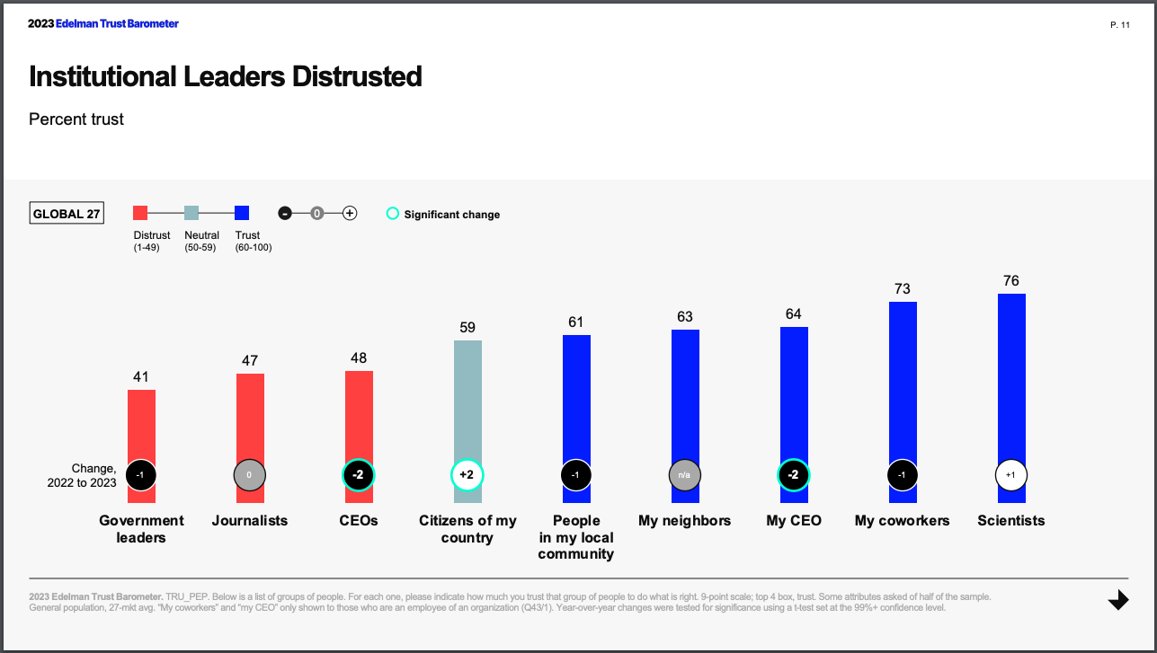 The 2023 Edelman Trust Barometer, now in its 23rd year of publication, is based on an online survey of 32k respondents across 23 countries. It measures the levels of trust that the general public has toward different institutions.