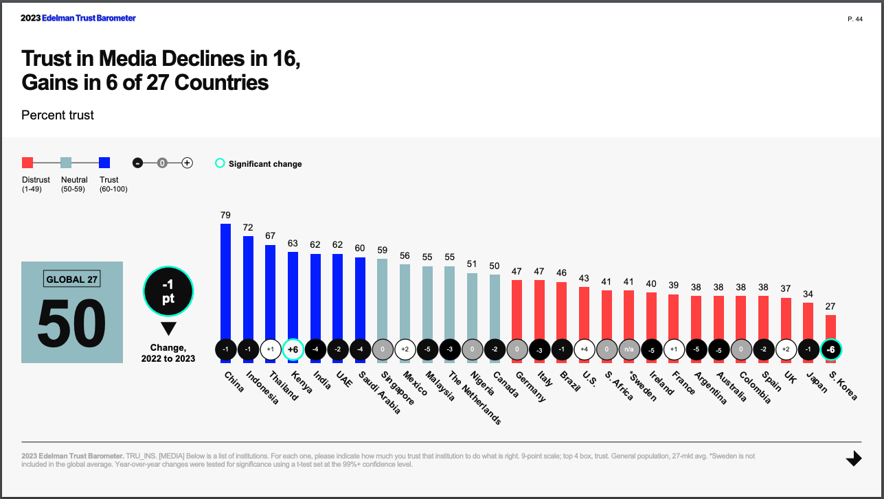 Taken as an institution, the media industry is at the bottom of the pack. People think businesses, NGOs and even governments are more trustworthy. None of these institutions has shifted greatly over the last year.