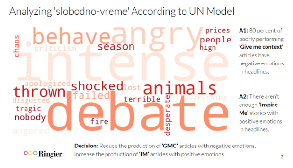 The learning: "The biggest impact was made when the Blic.rs editorial recognised that we were already doing something like user needs and that we could relatively easily expand our existing workflow to make it more efficient," says audience development manager Nikolina Govoruša.