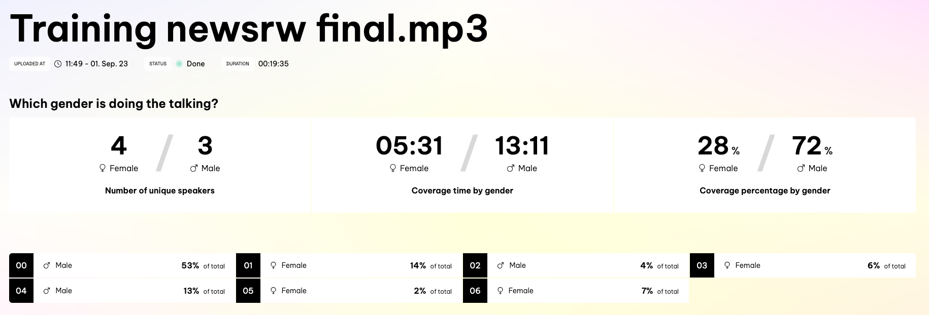 It shows the individual guests in the clip, how many minutes they spoke for and what percentage of the conversation that equates to. It also shows the total breakdown of female and male voices.