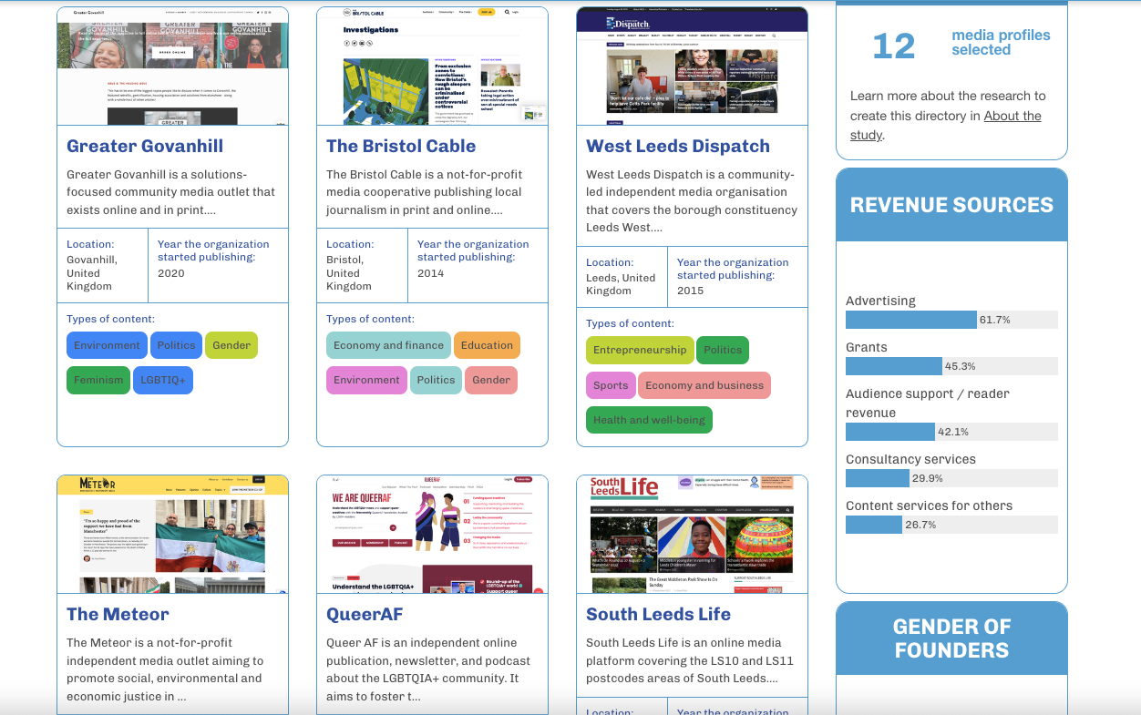 Media profiles contain a broad description of the organisation, plus its location, founding year, publication language, type of coverage. There is a content section detailing themes and types of reporting, plus which tech platforms and mediums it uses. There is also a business and revenue source section detailing tax status and revenue sources.