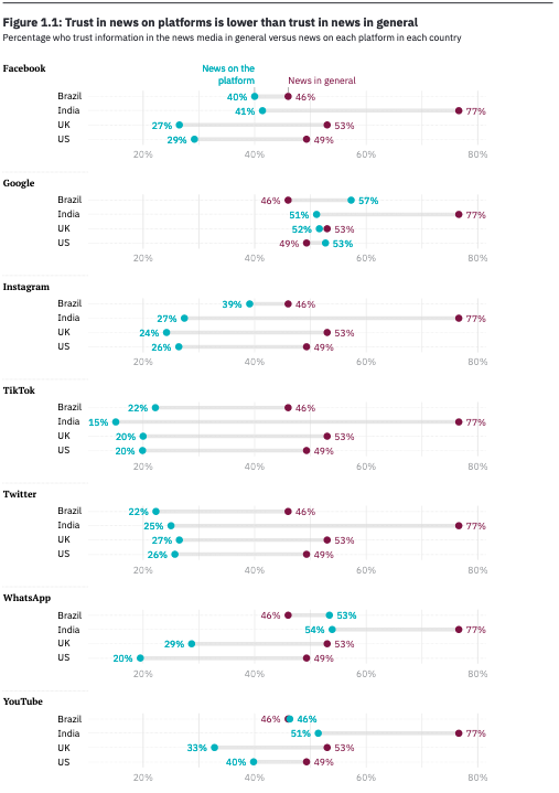 The report concludes: "The trust gap we document in this report is likely a reflection of this mismatch in audience perceptions about what platforms are for, the kinds of information they get when using these services, and how people think more generally about news media."