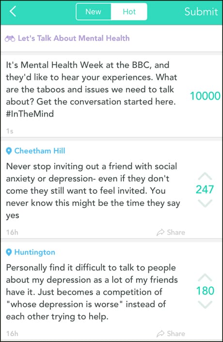 An experiment in the UK followed, with the team engaging with Yik Yak users as part of the BBC's Mental Health Week in February. The idea behind the project was that young people who might be afraid of talking publicly about mental health on platforms such as Facebook or Twitter, might be more likely to open up under the anonymity that Yik Yak can provide.