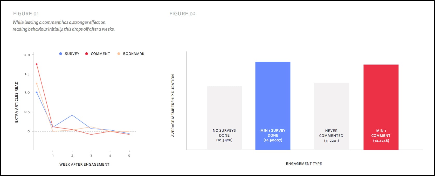 Surveys can be a useful tool to gauge good topics and angles to tackle. Playbook figures show that readers who complete surveys after a four-week period experience more sustained reading and remain members for longer.