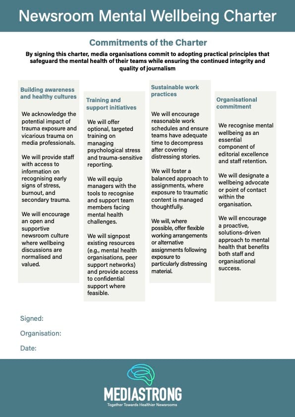 In a busy, deadline-orientated, fast-paced newsroom, it is easy for mental health to slip down the priority list. The charter ensures mental health remains a top priority and those who raise the flag on mental health will be taken seriously.