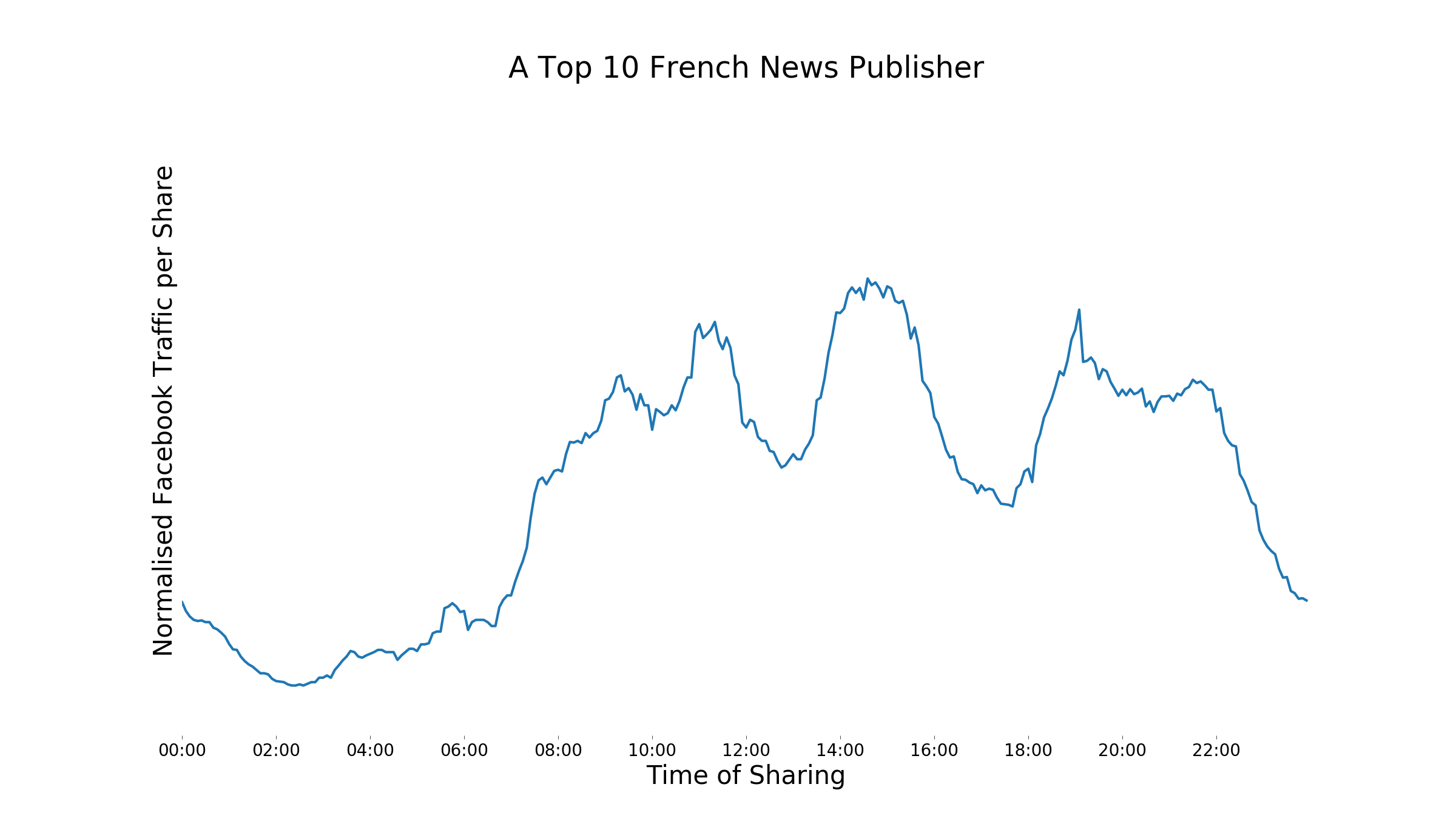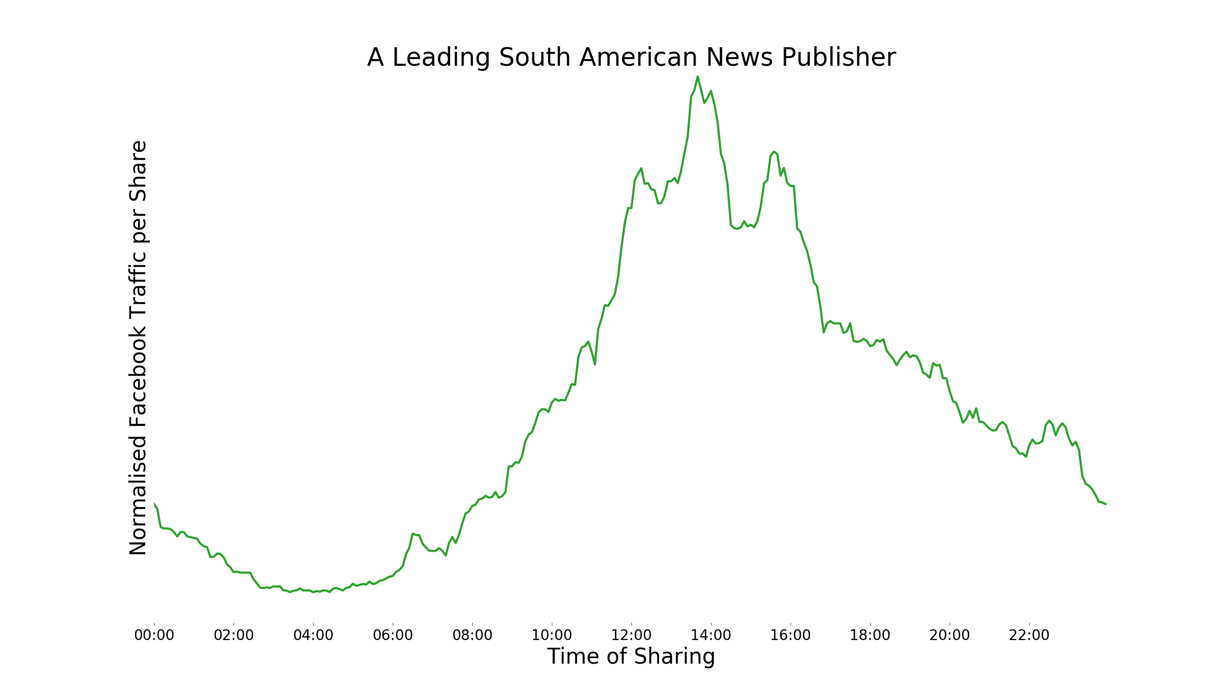 The South American publisher achieved its best performance when sharing between 11am and 4pm, but performed poorly at other times. The UK and French publishers achieved more consistent results throughout the day, but each experienced peaks in share traffic at different times.