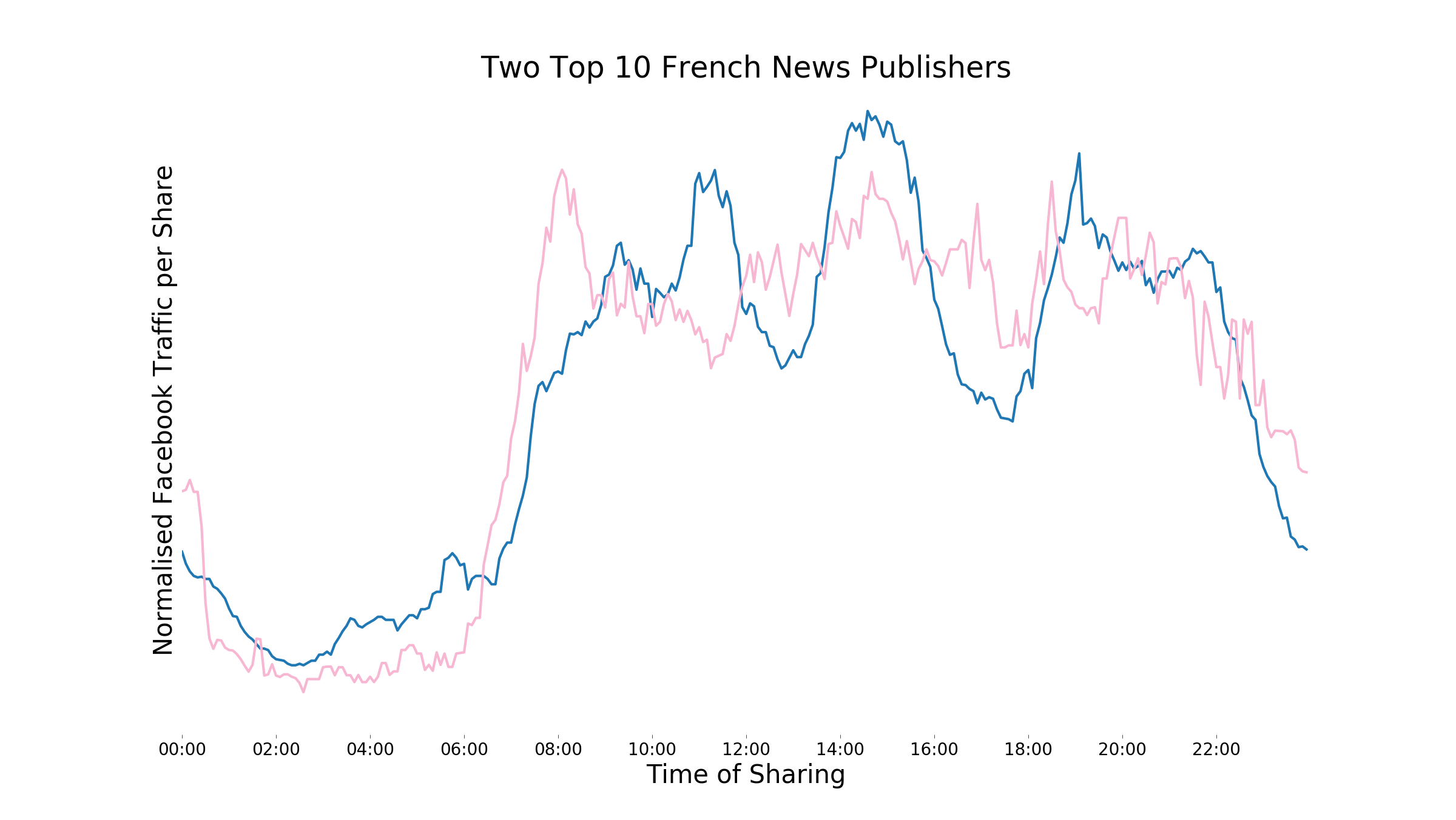 Even for two publications of equivalent size working in the same country stark differences were found in audience behaviour. A further test of the French news publisher against a second French news publisher found crucial differences in activity. Despite a similar pattern of peaks and troughs, the peaks occurred at different times of the day and achieved different relative highs and lows for each site.