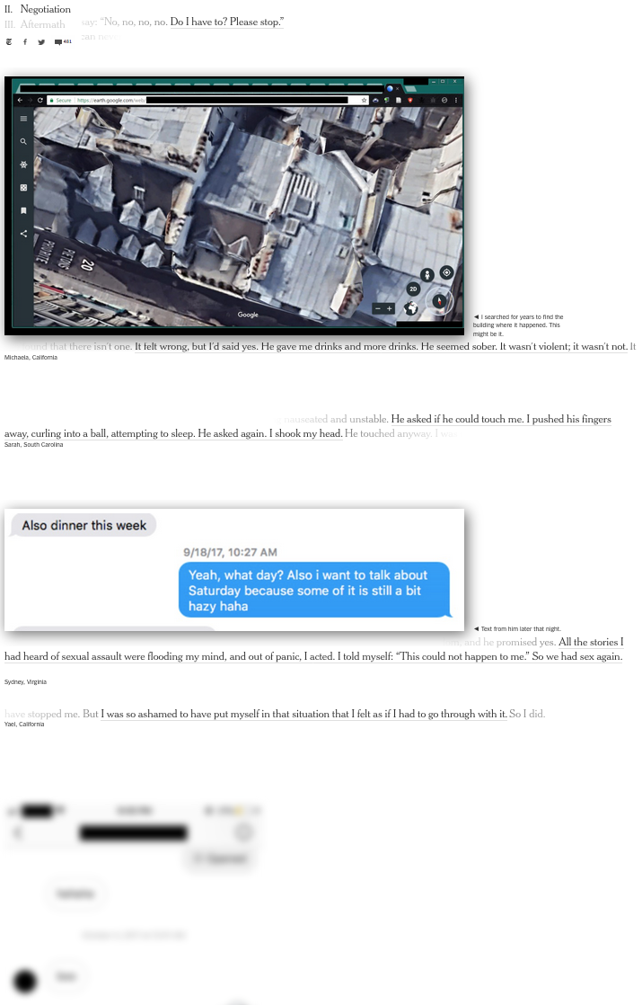 The striking revelation of similarities between the stories, which included themes like heavy drinking, consenting to be polite, and feelings of regret in the aftermath, was something that the team at the NYT wanted to highlight to audiences through an interactive feature.