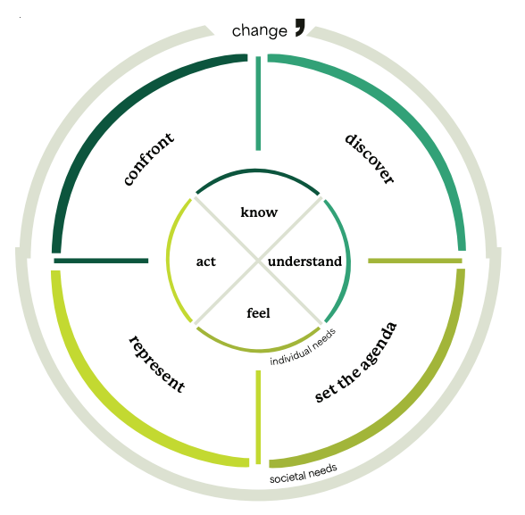 The foundation of the Public Method is the rose model. In this model, the individual needs of the public (shown in the inner ring) are combined with the needs that we as a society have for journalism (the words in the outer ring).