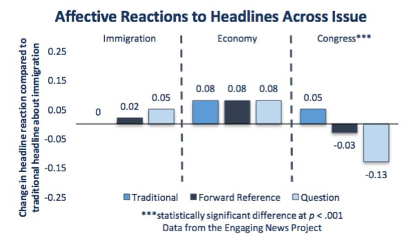 As well as eliciting more negative reactions and expectations for the story that would follow, question-based headlines also prompted readers to report less expected engagement with the story than traditional or forward-reference headlines.