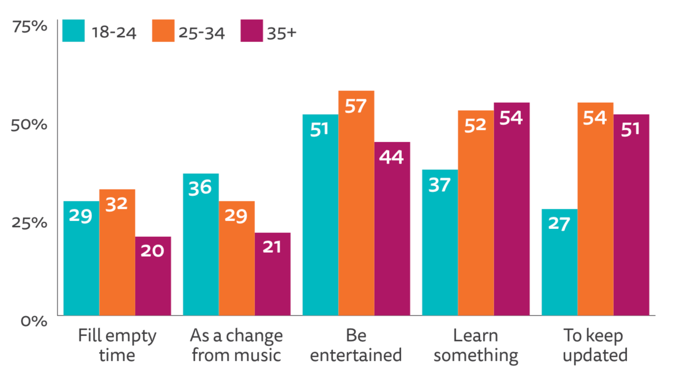 In the UK specifically, we also see differences between within younger age groups: 18–24s, sometimes referred to as Gen Z, are more likely to be looking for entertainment or for a change from music; 25–34s, often called Gen Y, are also looking to be entertained and fill empty time, but want content that helps them learn and keeps them updated.