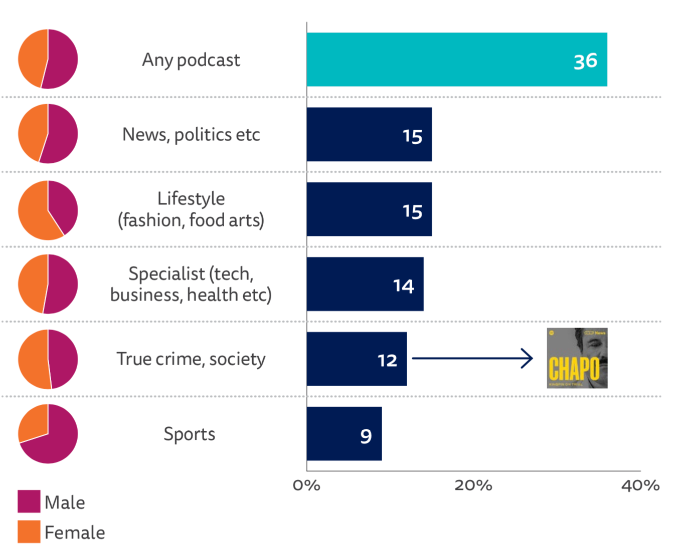 Given the insights above, it is worth noting that politics and news (15 per cent) is just one part of the content universe. Other popular genres include lifestyle content (15 per cent), true crime (15 per cent), specialist interest (14 per cent), and sports (9 per cent). But many podcasts defy classification with news often discussed in new ways through comedy and celebrity. Young people are listening to podcasts that entertain and inform. This is why many daily podcasts like The Daily from the New York Times use narrative storytelling techniques pioneered in true crime formats such as Serial to add suspense and jeopardy, to keep listeners hooked. Vice and others are applying these techniques to blockbuster documentaries like Chapo, Kingpin on Trial.