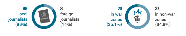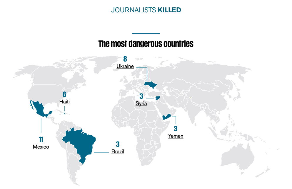 War zones became the riskiest stories to cover, resulting in more deaths of journalists than those investigating organised crime, corruption, protests and environmental issues.