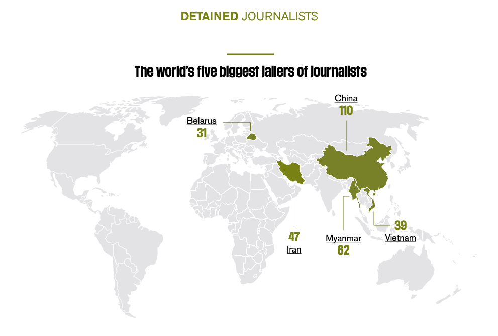 China, a country where censorship and surveillance levels have become extreme, still leads the way with 110 imprisoned journalists. It is also the country with the most imprisoned journalists belonging to a single news organisation: Jimmy Lai, the founder of Hong Kong’s Apple Daily newspaper (which the authorities closed in 2020), and six members of his staff, are accused under the national security law of "conspiracy to collude with a foreign country or with external elements." All face the potential of life imprisonment.
