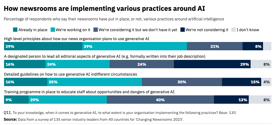 Not everyone is sold on these ideas though. Strikingly, 29 per cent of respondents said they were not considering having a designated person to lead all editorial aspects of generative AI.
